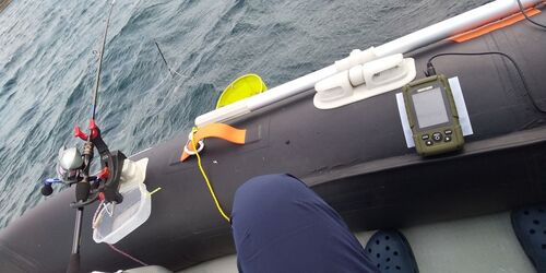 魚探(Luckylaker Y2020CD)を使ってみました。場所は元名海岸です。仕掛けはアジ五目とカワハギ用の胴付きを持っていきました。 100均で大判のマジックテープを買ってきて、シートレールの上の方に貼りました。思いのほか、しっかり固定でき、見やすいし操…
