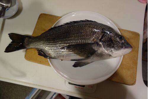 *********************************** ①1.3kgのクロダイ。 今回の素材です。43cmあります。まな板よりでかい・・・。釣った直後、キッチンバサミで鰓を切って血抜きをしてあります。 *********************************** ②カルパッチョ 妻がサラダを作った…