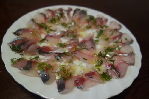 アジのカルパッチョ アジ2尾を薄造りにして皿に並べ、ソースと刻んだシソをかけます。ソースは、レモン汁小さじ3、オリーブオイル小さじ4、塩小さじ1/5、砂糖小さじ1/5、コショウ少々です。身は三枚におろしてからキッチンペーパーにくるんで2-3時間置くと水…