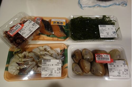 <鍋材料>・魚 類:秋サケ3切れ 198円・甲殻類:わたりがに 230円・貝 類:あおやぎ 184円・藻 類:切りコンブ 138円 合 計:750円------------- ① わたりがに、あおやぎ、切りコンブに塩を振って、もみます。10分くらい置く。------------- ② 沸騰した鍋に…