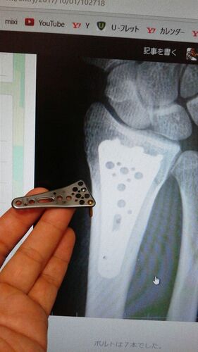 本日、右手首の金具(プレート)を抜く手術をしました。専門用語で抜去(ばっきょ)というようです。流れは、埋め込むときと同じ。 ①左手に点滴。(前回は2度、今回は1度失敗)(涙) ②鎖骨より伝達麻酔。(今回は前回ほど効かず、局部麻酔をしながらの施術…
