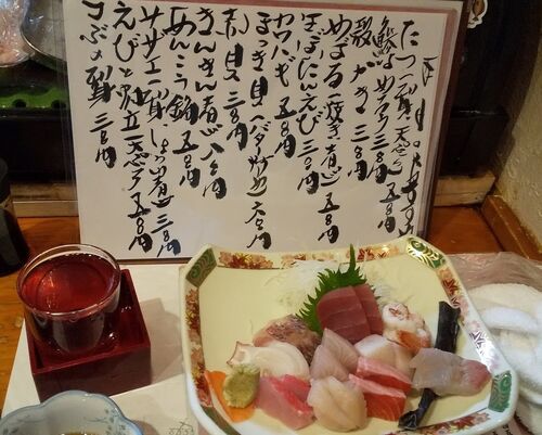 蘇我の芝浜は、少々変わった造りの店で、ドアを開けると手前は魚屋になっている。魚屋を通り抜けて、もう一回ガラス戸を開けると、そこから居酒屋になっている。魚屋がやっている居酒屋ということで、興味津々だったが、私が行くといつも満席で入れた試しが…